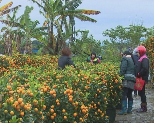 年桔檔主王先生:現在消費最多的就是這種小的(年桔),大盆的(年桔)消費的人并不多。這種小盆的35元,這種是4寸的,這種一般賣200多,利潤也就30多塊錢左右。大盆的不敢拿貨,要5.6百(一盆),我們以前賣大的比較多。(記者:郭雪珍)