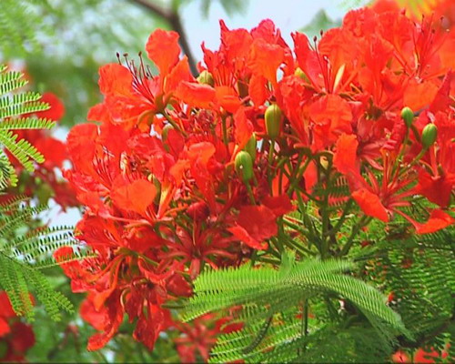 據介紹,鳳凰木一般冬天落葉,春天吐綠,夏天開花,花期在每年的5月至8月。每逢花開時節,一片火紅的鳳凰花盛開在樹的頂端,配上鮮綠色的羽狀復葉,如美麗的孔雀開屏,異常漂亮,有興趣的市民可在花期內前往文化廣場觀賞。(記者:廖洪標)