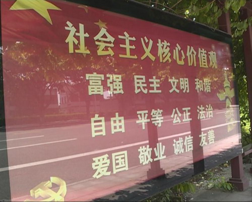 記者譚恩婷:記者身后的公交候車亭不僅設(shè)置了公交線路指示牌,還貼滿了核心價(jià)值觀的宣傳標(biāo)語(yǔ),宣傳社會(huì)主義核心價(jià)值觀,讓文明創(chuàng)建工作深入民心。