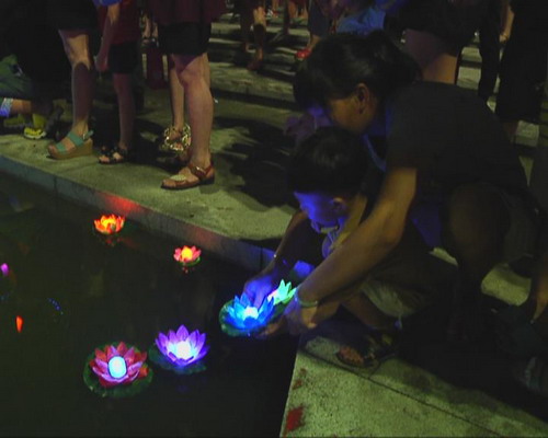 林宇婷:記者現在在水鄉公園的放荷燈處這里,在這里看到不少的賓客都在這里放荷燈的,他們紛紛在荷燈上寫上自己的愿望和對未來一個祝愿,五彩繽紛的荷燈放到荷邊是非常漂亮的。