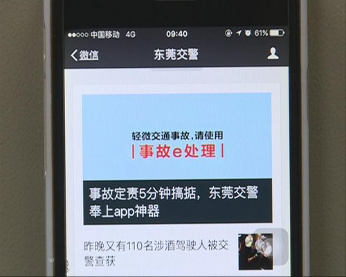 這是“廣東事故e處理”移動互聯網東莞在線服務平臺,這款軟件最大的特點就是界面明晰,操作簡便。市民通過關注“東莞保險”“東莞交警”微信公眾號,或預先下載“交警在線”APP均可“一站式”辦理事故定責、保險理賠等事宜,省去了在現場等候處理和前往保險公司辦理理賠等手續,進一步拓寬了輕微交通事故“快處快賠”的辦理方式。只要事故當事人駕駛證、行駛證、保險單證等證件齊全,只需幾分鐘,所有程序均可通過“事故e處理”輕松搞定。