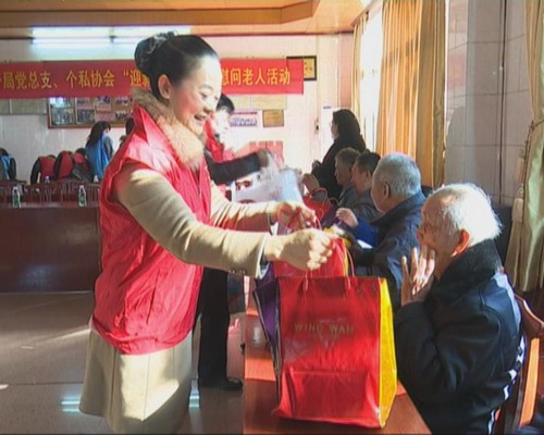 老人之一:他們對我們老人好關(guān)心,經(jīng)常給禮物給我們,看望我們、問候我們,又送禮物給我們,又給食品,又給禮物,我們都覺得好高興,好歡喜。