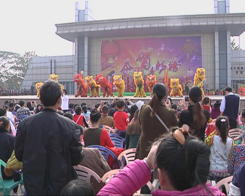 巡游結束后,龍獅表演在文化廣場上演,觀眾里里外外將表演場地圍個水泄不通,場面熱鬧非凡。龍獅隊伍分別表演了龍騰虎躍、醒獅踩青、踩高樁等,在醒獅踩高樁中,隊員們紛紛使出看家本領,精彩、驚險的表演令觀眾鼓掌叫好。現場除了龍獅表演,還有功夫扇、武術表演等節目,熱鬧喜慶的醒獅表演,也贏得了現場觀眾的陣陣叫好。