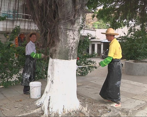記者在望洪公路五涌、下漕等路段看到鎮園林綠化工人正一手拿刷子,一手提著裝石灰水的桶給樹木刷白,蔥郁成蔭的樹木刷白后,猶如穿上了整齊亮眼的“白大褂”。