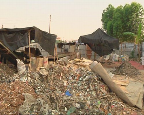 這家無證無照廢鐵篩選加工場位于位于上合村的林屋路口,占地面積約300多平方米,記者跟隨執法人員在現場看到,加工場周圍用藍色鐵皮圍著,以掩人耳目,走進加工場內,中間是用鐵皮搭建的簡易窩棚用于住人,窩棚前后均擺放有篩選廢鐵的機械設備,并建有2個簡陋的沉淀池,里面是水洗工序流出來的骯臟礦渣污水,沉淀池里污水四溢,工場地面晾曬著洗好的廢料,并堆放著幾堆已洗好的廢鐵礦和礦渣。