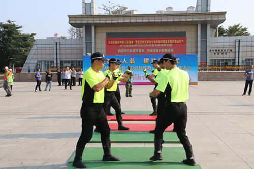本次比賽共設有民警“槍支拆裝”項目、輔警隊員“丁字棍術”項目、全鎮45家消防安全重點單位兼職消防員參加的原地著戰斗服拿滅火器滅火操等三個項目?;顒舆€組織鎮消防隊專職消防員在文化廣場舉行了手抬機動泵單干線出一支水槍操比賽。