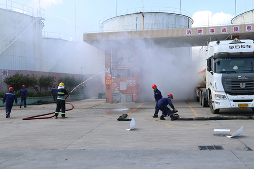 當日15:00演練正式開始,本次演練模擬偉業油庫發油平臺往罐車內輸送燃料油時,由于槽車駕駛員誤操作導致鶴管斷裂,燃料油泄露發生火災,油庫迅速啟動應急預案,開展報警、疏散、滅火等自救行動;鎮消防大隊收到事故報告后,調派應急力量前往事故企業開展先期處置;鎮應急管理分局核實事故信息后,上報鎮領導并按照指示立即啟動鎮級危險化學品生產安全事故應急響應,趕往現場成立現場指揮部,展開救援工作;經過鎮各救援單位的迅速應急處置,起火罐車大火被撲滅,傷員得到了及時救治,油車殘留燃料油成功進行倒罐,演練圓滿成功。