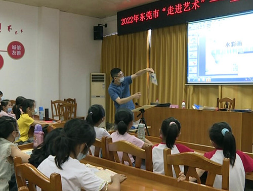 在開班儀式上,特邀了廣東省美術家協會會員、東莞市美術家協會理事、望牛墩鎮美術學科帶頭人曾雷進行授課,曾雷詳細介紹了水彩畫的工具及應用、水彩特殊技法、構圖以及色彩知識等,并積極與在場的孩子們進行交流,用現場示范教學的方式向在場的小朋友展現不同的水彩工具表現出的線條、渲染效果等,使孩子們初步掌握水彩風景畫的知識,更熟練使用不同工具發揮想象。