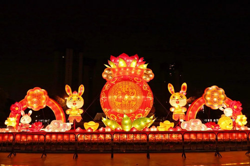 2023年望牛墩鎮的迎春燈飾主要結合“兔”生肖卡通造型配合時花、燈飾為主題,造型變幻多姿,為即將到來的兔年春節營造了萬家燈火、祥和溫馨的氣氛。