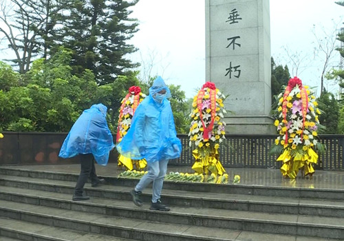 當天,參加祭掃的成員懷著對革命烈士無比崇敬和深切懷念的心情,頂著毛毛細雨,在傲然聳立的烈士紀念碑前列隊肅立、低首默哀。
