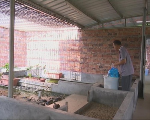 位于奧運蔬菜基地旁的這戶庭院式養龜場,場主叫麥順全,是土生土長的望東村人,走進他的自建住宅內你會看到,圍繞院子中間的水塘邊,用水泥砌了一個個分隔開的小水池,水池里養殖有不同種類的龜。自建住宅內還設有育龜房、孵化室,就連樓頂也充分利用,建成了小型的龜池。
