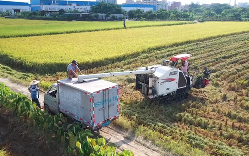 記者在望牛墩鎮(zhèn)官洲村水稻田看到,一望無(wú)際的稻田里稻谷飄香,烈日下的稻田一片金黃,農(nóng)戶(hù)利用當(dāng)前晴好天氣,正忙于早造水稻收割工作。一臺(tái)收割機(jī)來(lái)回穿梭,收割、脫粒、碎稈還田,收割機(jī)內(nèi)稻谷滿(mǎn)倉(cāng)后,通過(guò)自動(dòng)化管道將稻谷直接輸送到田邊的車(chē)上,然后運(yùn)走曬干,收割運(yùn)輸過(guò)程一氣呵成。