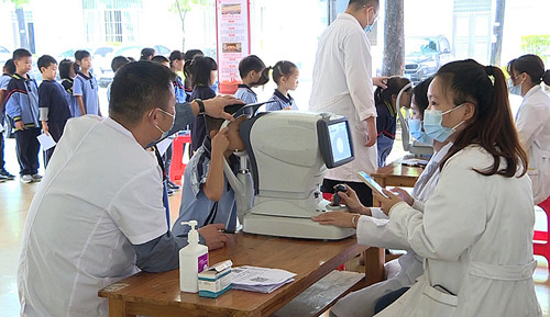 記者在實驗小學看到,學生們在醫(yī)護人員和老師的引導下,依次完成了遠視力檢查、非睫狀肌麻痹屈光度檢查、角膜曲率及眼軸長度等4個項目檢查。