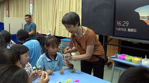 活動中,陳杰芳老師向學生們介紹七夕文化、七夕貢案的基本裝飾品——手工花的歷史淵源,詳細講解制作手工花所需的材料及工具,并示范如何制作貢案手工花。學生們聚精會神地聽著,化身為“小小非遺傳承人”,跟著老師的步驟動手制作,體驗七夕貢案手工制作的樂趣。