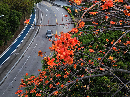 木棉花,別名“英雄花”,因其花朵開得紅艷但又不媚俗,花瓣顏色紅得猶如壯士的風骨,往往一棵木棉樹上,就開滿成百上千的紅色花朵,遠望如一把把火炬,又如一個個紅色的驚嘆號,頗為壯觀,加上木棉樹的樹冠總是高出周圍的樹群以爭取陽光雨露,暗合奮發向上的精神。(記者:梁婷婷 周國威)