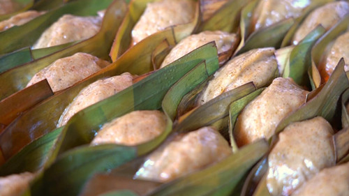 只見興姨她們熟練地抓起一團團小面團,壓平面皮,將其捏成中間凹的形狀,包上炒熟的餡料,簡單封口后一個個整齊地擺放在清洗好的蕉葉上,放進鍋中蒸上十五分鐘就能出爐了。揭開鍋蓋,艾草的陣陣清香撲鼻而來,趁熱淺嘗一口,豐富餡料與帶點微苦的艾味搭配相宜,口感軟糯,香甜不膩,令人陶醉。