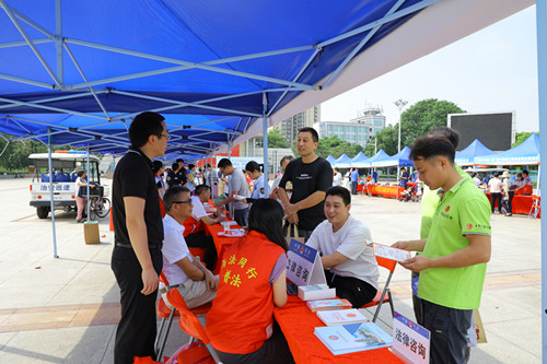 活動現(xiàn)場,各普法部門把民法典、《廣東省法律援助條例》、《優(yōu)化營商環(huán)境條例》、《保障農(nóng)民工工資支付條例》等法律法規(guī)設(shè)計成普法展板、宣傳畫冊,通過有獎問答、熱點(diǎn)介紹等形式,重點(diǎn)宣傳平等、自愿、公平、誠信、公序良俗、綠色等民事活動基本原則內(nèi)容,以及國家新出臺的優(yōu)化營商環(huán)境相關(guān)法律法規(guī)等。參加活動的群眾興致滿滿,躍躍欲試,通過翻書本、看宣傳冊、查手機(jī)等進(jìn)一步了解相關(guān)知識,變被動普法為主動學(xué)法,參與者對于答題贏得的獎品也是倍感自豪。