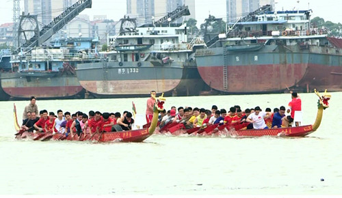“咚!咚!咚……”在訓練現場,未見其舟,先聞其聲,雄壯的吆喝聲夾雜著隆隆的鼓聲響徹河邊,各龍舟隊正伴隨著鏗鏘的鼓點奮力訓練。