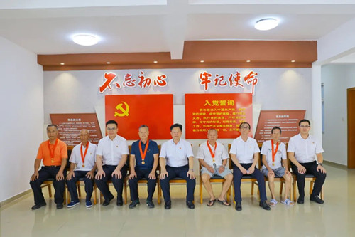 鄭曉堅為今年新增的50年黨齡黨員同志依次頒發并佩戴“光榮在黨50年”紀念章,并致以崇高的敬意和誠摯的問候。