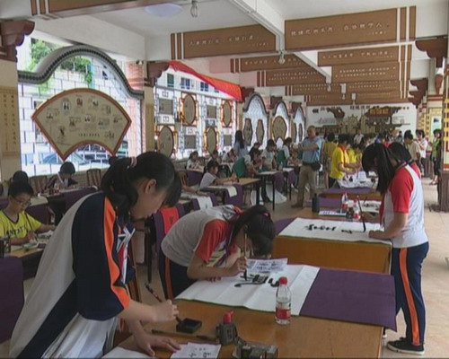 鎮團委 陳婉霞:我們團委今天在這里舉行青少年書法大賽,主要是為了慶祝五四青年節,發掘我鎮青少年書法人才,豐富青少年的文化生活,我們這個比賽主要分為少年組和初中組,一共有60名青少年參加。(記者:郭雪珍)